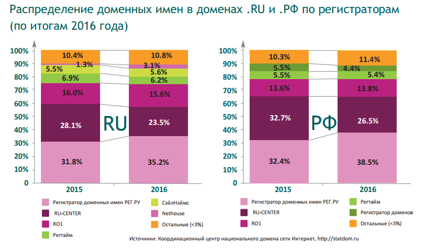 В среднем чем крупнее регистратор, тем больше у него ресурсов для перерегистрации домена. Релевантной становится статистика по распределению долей рынка среди регистраторов. Три крупнейших регистратора занимают 70% рынка.